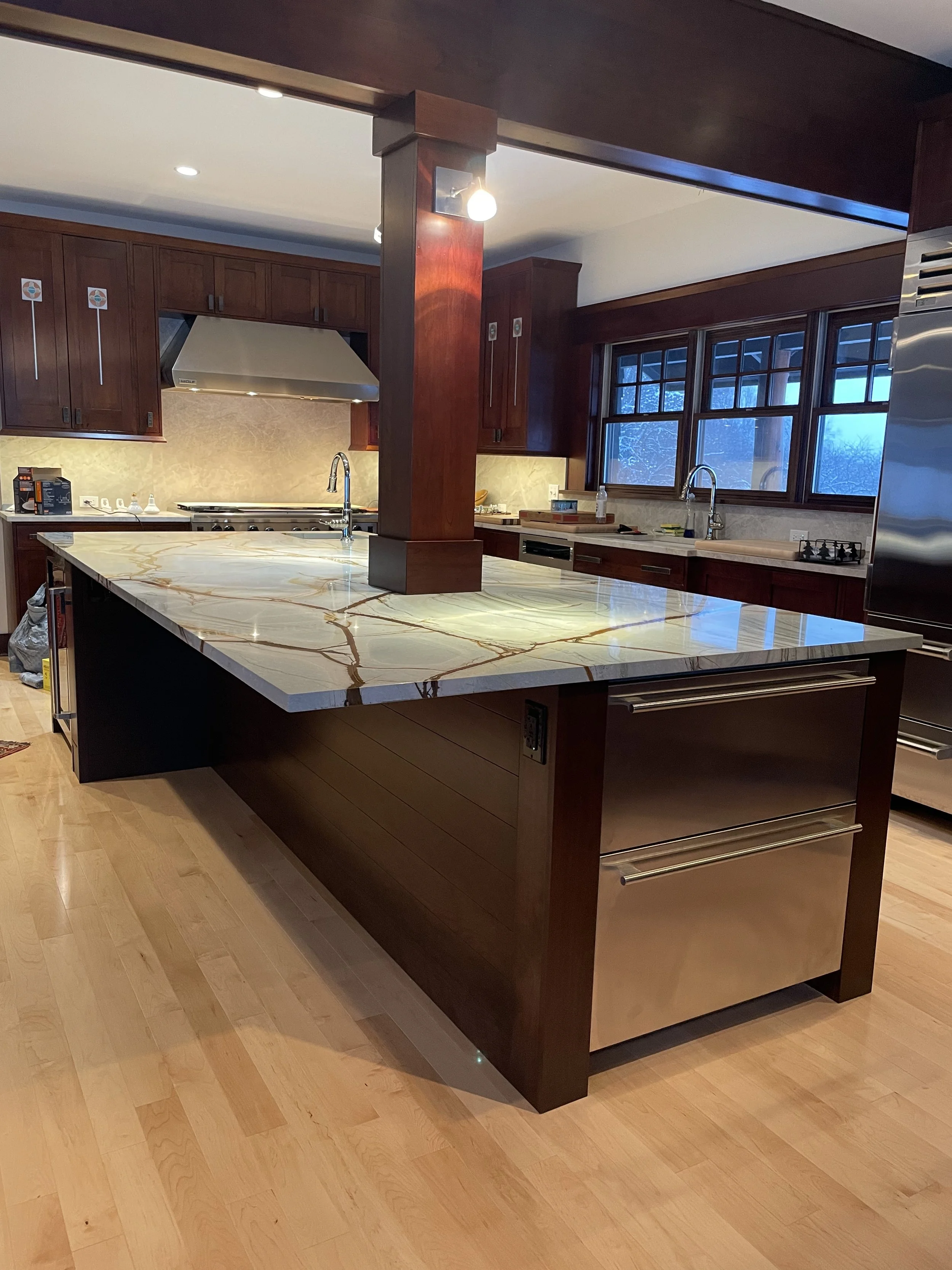 A damaged kitchen required a new island to be color-matched to the existing cabinets, leading to this spacious and functional piece.